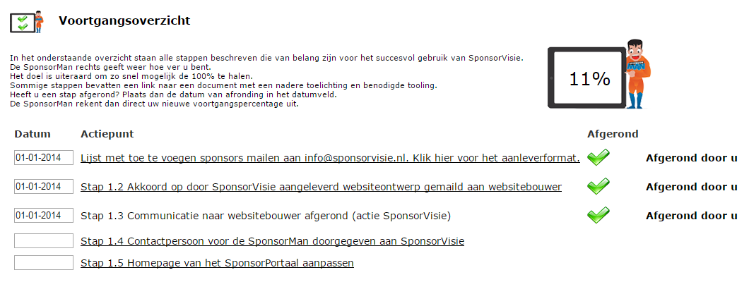 Log in met uw verenigingslogin en u ziet direct na het inloggen aan de SponsorMan hoe ver u al bent. Controleer het overzicht op stappen die u al gezet heeft. U ziet na het opslaan uw nieuwe voortgangspercentage. Vervolgens kiest u zelf een volgende stap die u kunt zetten. U bepaalt het moment en de volgorde. Het voortgangsoverzicht is uw leidraad.